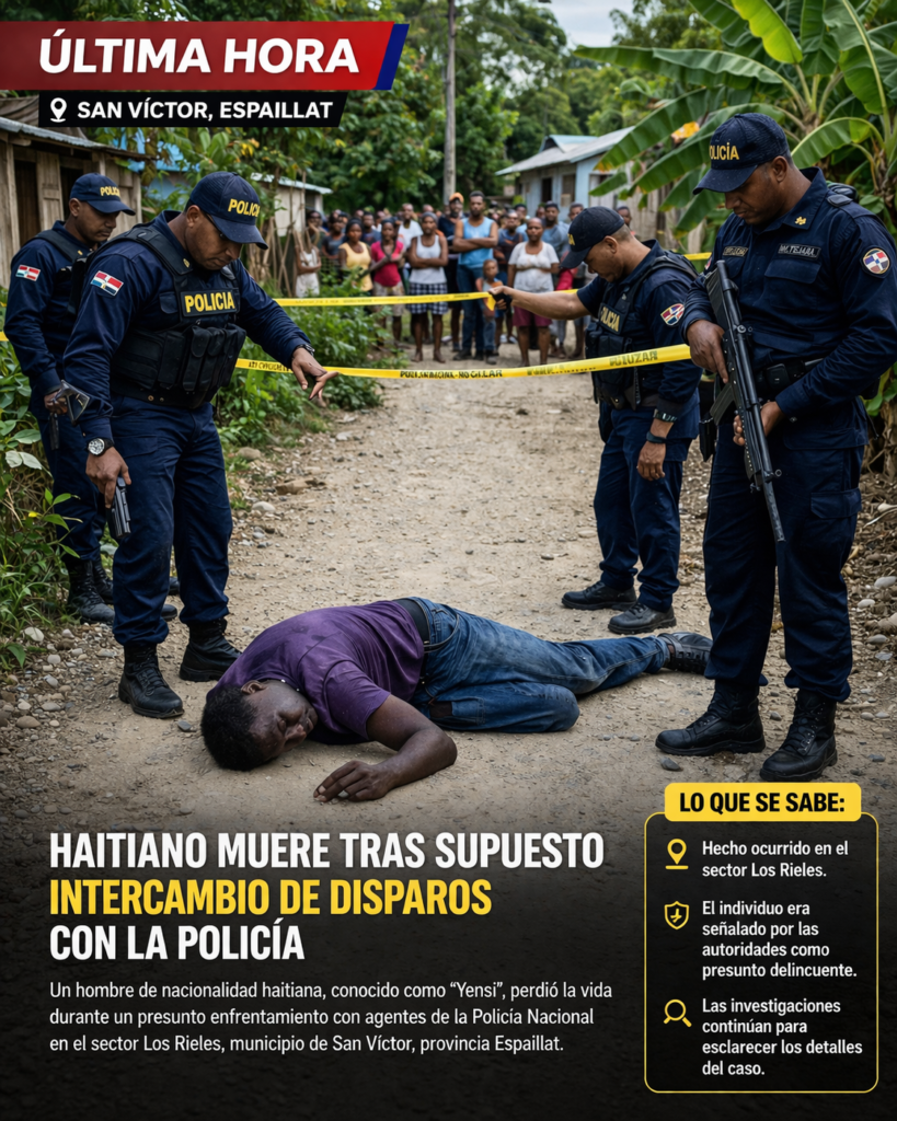 Un hombre de nacionalidad haitiana, conocido con el apodo de “Yensi” y señalado por las autoridades como presunto delincuente, murió este viernes durante un supuesto intercambio de disparos con miembros de la Policía Nacional en el municipio de San Víctor, perteneciente a la provincia Espaillat.
