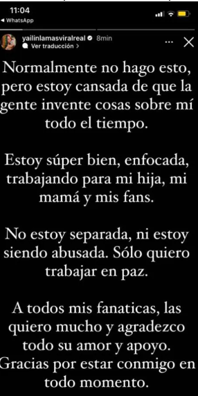 La artista Yailin la más viral, ha publicado dos historias que arrojan un poco de luz y nos permite conocer la situación actual. Ya que ella habría opto por ignorar este suceso y no dar ningún tipo de declaración al respecto. Aunque ya ha compartido dos historias desde su cuenta personal.